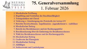 Nach der Begrüßung durch Bezirksobmann Ing. Bruno Haselwanter und dem Gedenken an 19 verstorbene Musikkameraden/innen aus den Musikkapellen des Verbandes seit der letzten Generalversammlung am 26.1.2020 berichtete der Bezirksausschuss nicht nur über die vom Bezirksverband organisierten Veranstaltungen, sondern auch über Ereignisse, bei denen Musikanten oder Funktionäre aus dem Bezirksverband beteiligt waren.